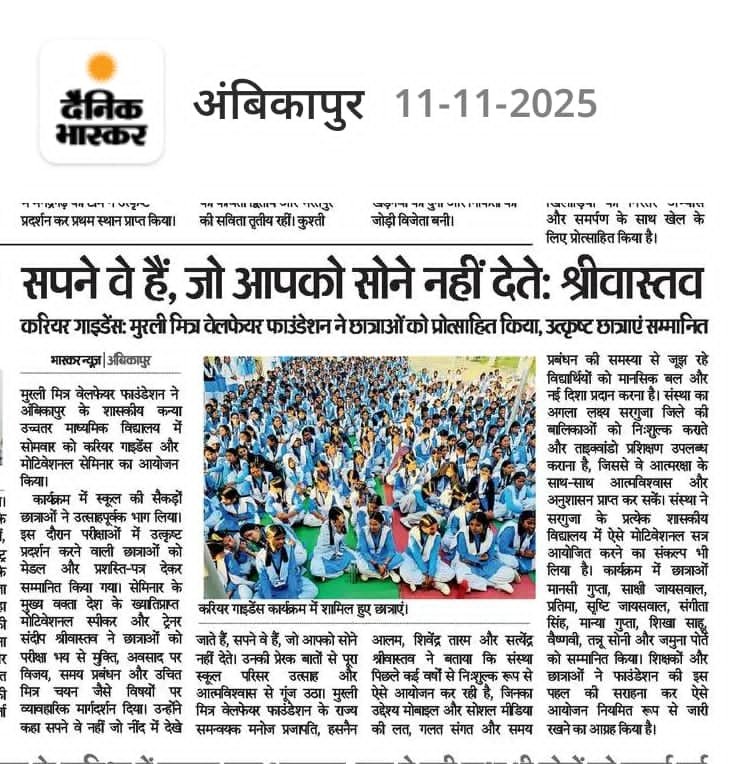 नमस्कार साथियों मैं आशा करता हूं आप स्वस्थ व सुरक्षित होंगे ।हमारे देश में हर रोज युवा एक सपना देख कर उठता है परंतु हर वर्ष 13000 से ज्यादा छात्र मानसिक दबाव व अन्य कारणों से आत्महत्या कर लेते हैं और तकरीबन 38000 से भी ज्यादा स्कूली छात्राओं के साथ रेप जैसे गंभीर अपराध होते हैं। मुरली मित्र ऐसे ही गंभीर सामाजिक समस्याओं को हल करने के लिए स्कूली स्तर पर बच्चों के मानसिक विकास के लिए कैंपेन आरंभ और और बेटियों को आत्मरक्षा  के लिए कैंपेन दुर्गा का आयोजन करती  है।