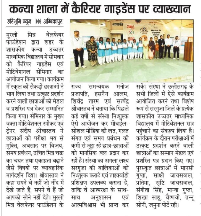 मुरली मित्र वेलफेयर फाउंडेशन ने छात्राओं के लिए कराया मानसिक विकास हेतु सेमिनार
